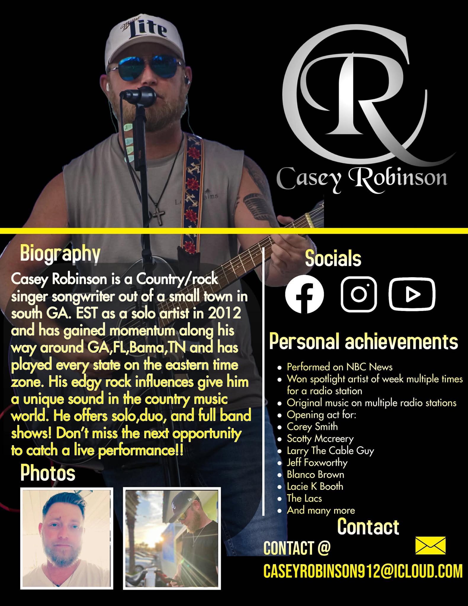 Casey Robinson is a Country/rock singer songwriter out of a small town in south GA. EST as a solo artist in 2012 and has gained momentum along his way around GA, FL, Bama and TN and has played every state on the eastern time zone, this is willing to travel. His edgy rock influences give him a unique sound in the country music world. He can play and entertain any small venue to fairs and festivals to private events.